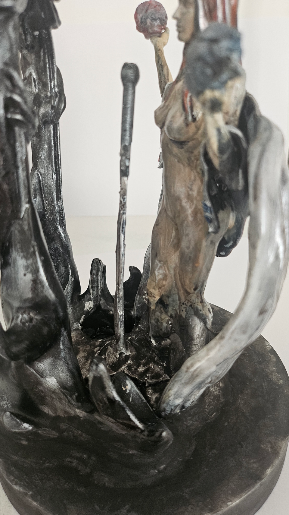 The sculpture’s patina shifts across its versions — from deep bronze to oxidized green to grungy, weathered hues — each finish resonating with a distinct emotional tone: rebirth, decay, and transcendence. The circular base, worn yet eternal, evokes ceaseless motion, as if the sculpture captures but a single frame in an infinite cycle of metamorphosis — a frozen heartbeat within the alchemical dance of the cosmos.